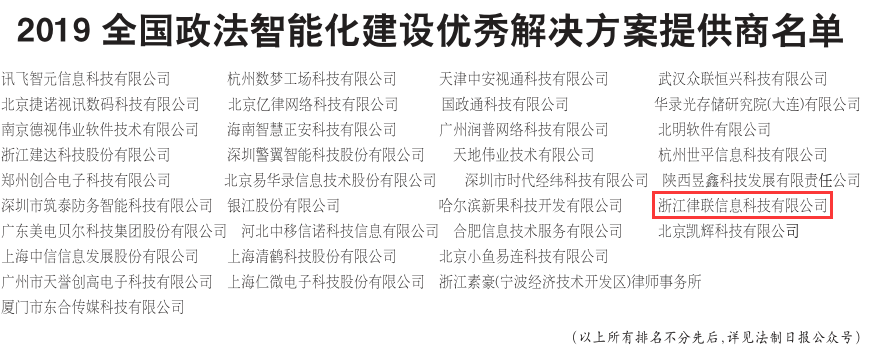 6月1日至9日,《法制日報》官方微信公眾號開展了為期9天的投票,6月10日,法制日報社舉行專家評審會,律聯科技的“e律師智慧律所應用系統”項目在本次活動當選“2019全國政法智能化建設優秀解決方案提供商”。
